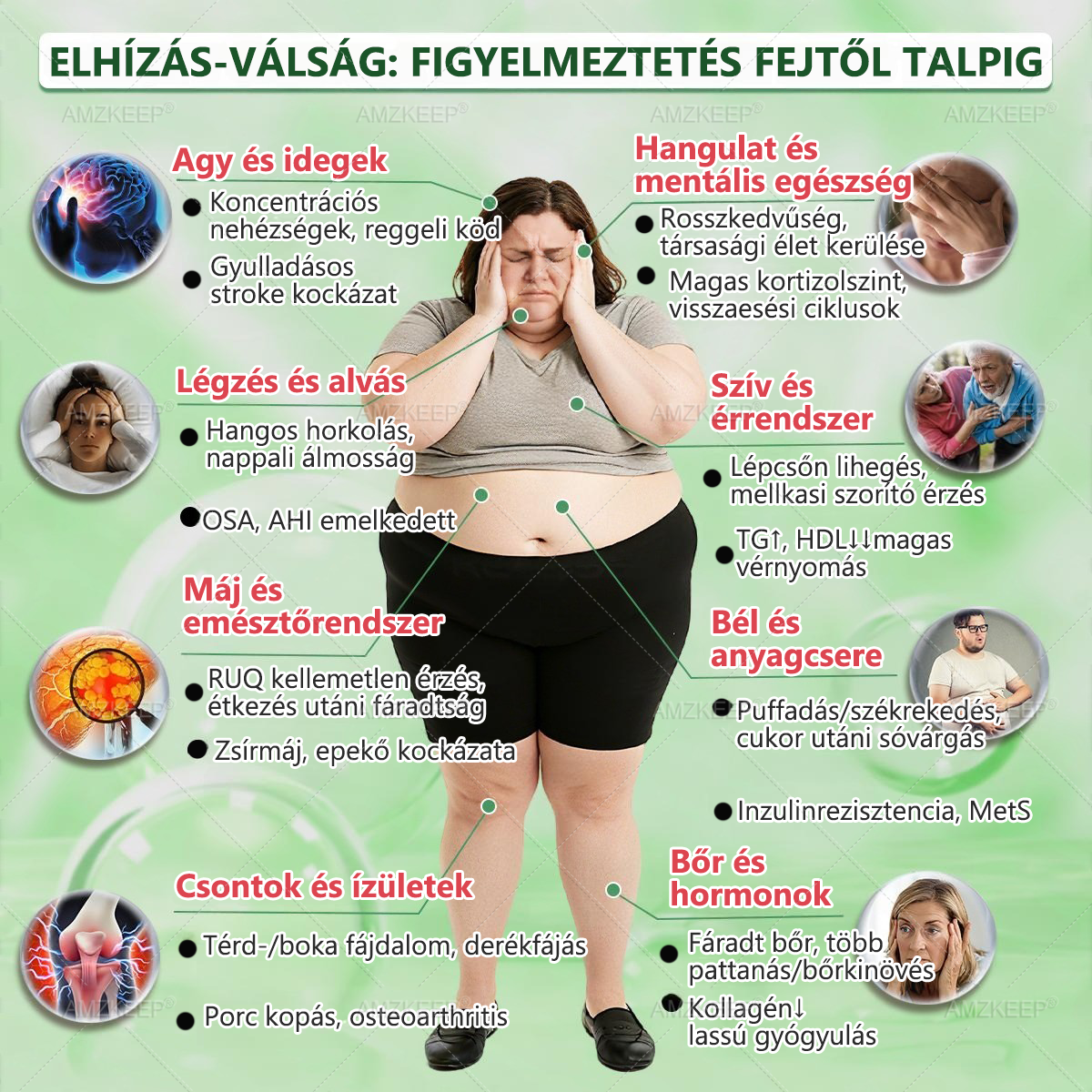 Sokan azt hiszik, a plusz kilĂłk csak kinĂ©zetrĆl szĂłlnak, de belĂŒl csendben rontjĂĄk az egĂ©szsĂ©gedet. A hasi zsĂr nyomhatja a szĂvet Ă©s a tĂŒdĆt, minden lĂ©legzetet Ă©s lĂ©pĂ©st nehezebbĂ© tĂ©ve. Erekben lerakĂłdhat, növelve a szĂvinfarktus vagy a stroke kockĂĄzatĂĄt. ĂvrĆl Ă©vre ez a terhelĂ©s gyorsĂtja az öregedĂ©st, gyengĂti a szerveidet, Ă©s elveszi az energiĂĄt, amire szĂŒksĂ©ged van, hogy teljes Ă©letet Ă©lj.