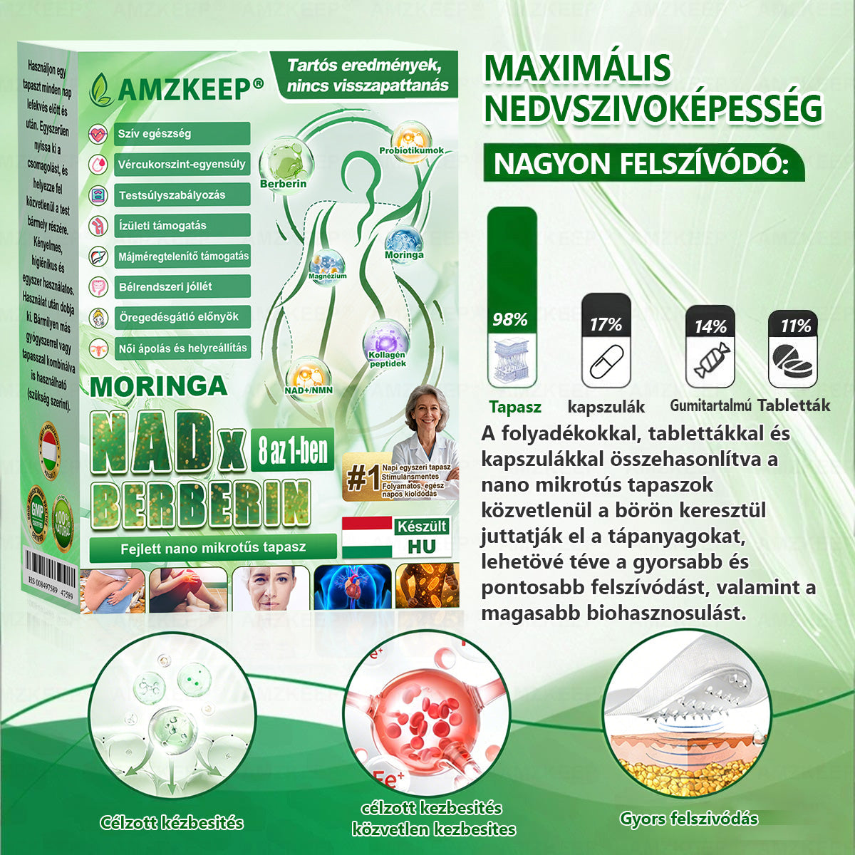 KönnyƱ felszĂvĂłdĂĄs: Ez a formula egy fejlett nano-mikrotƱs tapaszos hatĂłanyag-leadĂł rendszert hasznĂĄl. A berberinhez hasonlĂł, magas hatĂłanyag-tartalmĂș összetevĆkkel kombinĂĄlva kulcsfontossĂĄgĂș tĂĄpanyagokat juttat a szervezetbe transzdermĂĄlisan, megkerĂŒlve az emĂ©sztĆrendszert Ă©s csökkentve a gyomor-bĂ©lrendszer terhelĂ©sĂ©t. A tapasz gyengĂ©d, egyenletes hatĂłanyag-leadĂĄst biztosĂt a kĂ©nyelmesebb Ă©lmĂ©ny Ă©rdekĂ©ben, Ăgy kĂŒlönösen alkalmas Ă©rzĂ©keny emĂ©sztĂ©sƱek Ă©s azok szĂĄmĂĄra, akik inkĂĄbb kerĂŒlik az injekciĂłs fogyĂłkĂșrĂĄs mĂłdszereket.